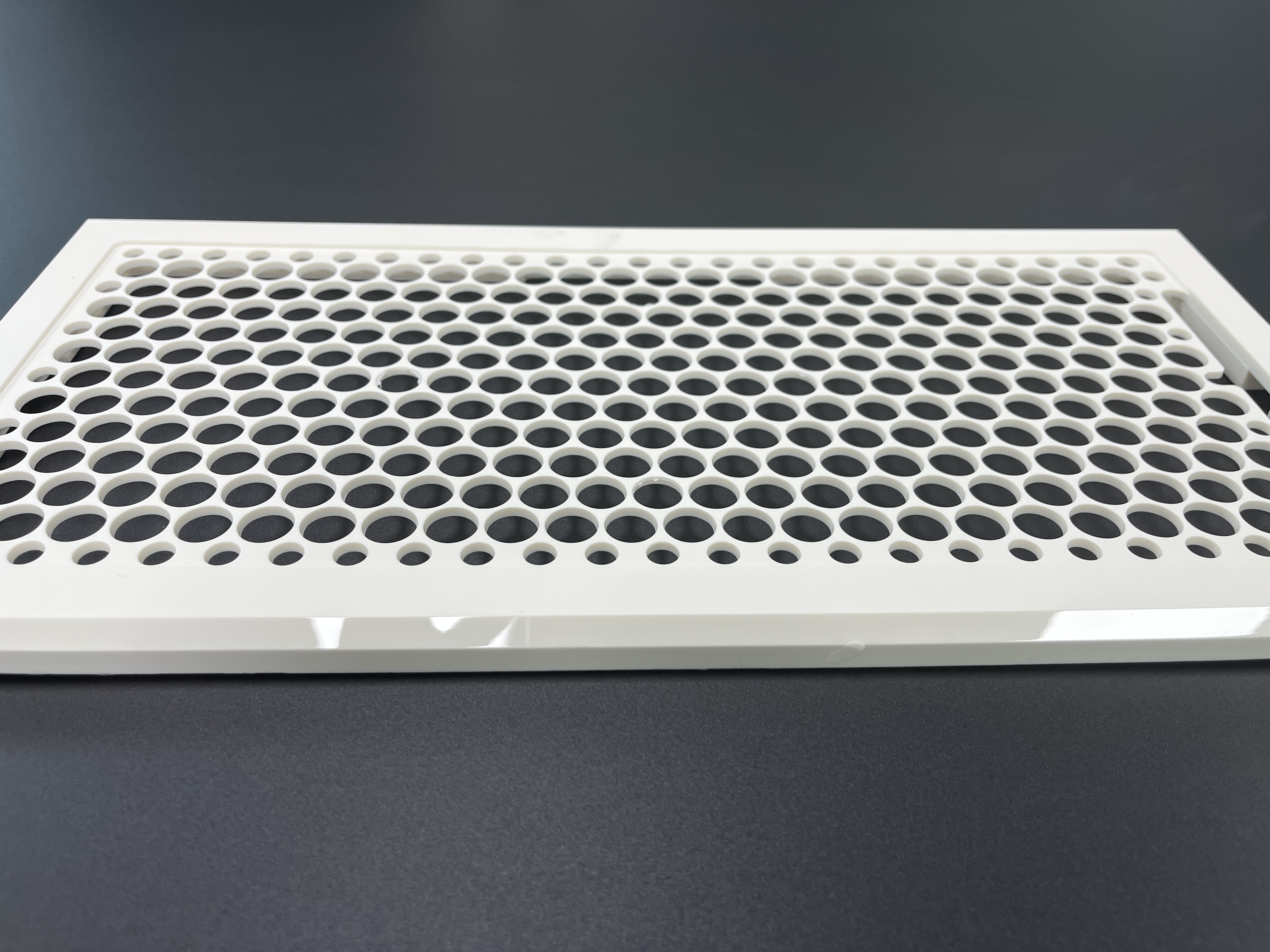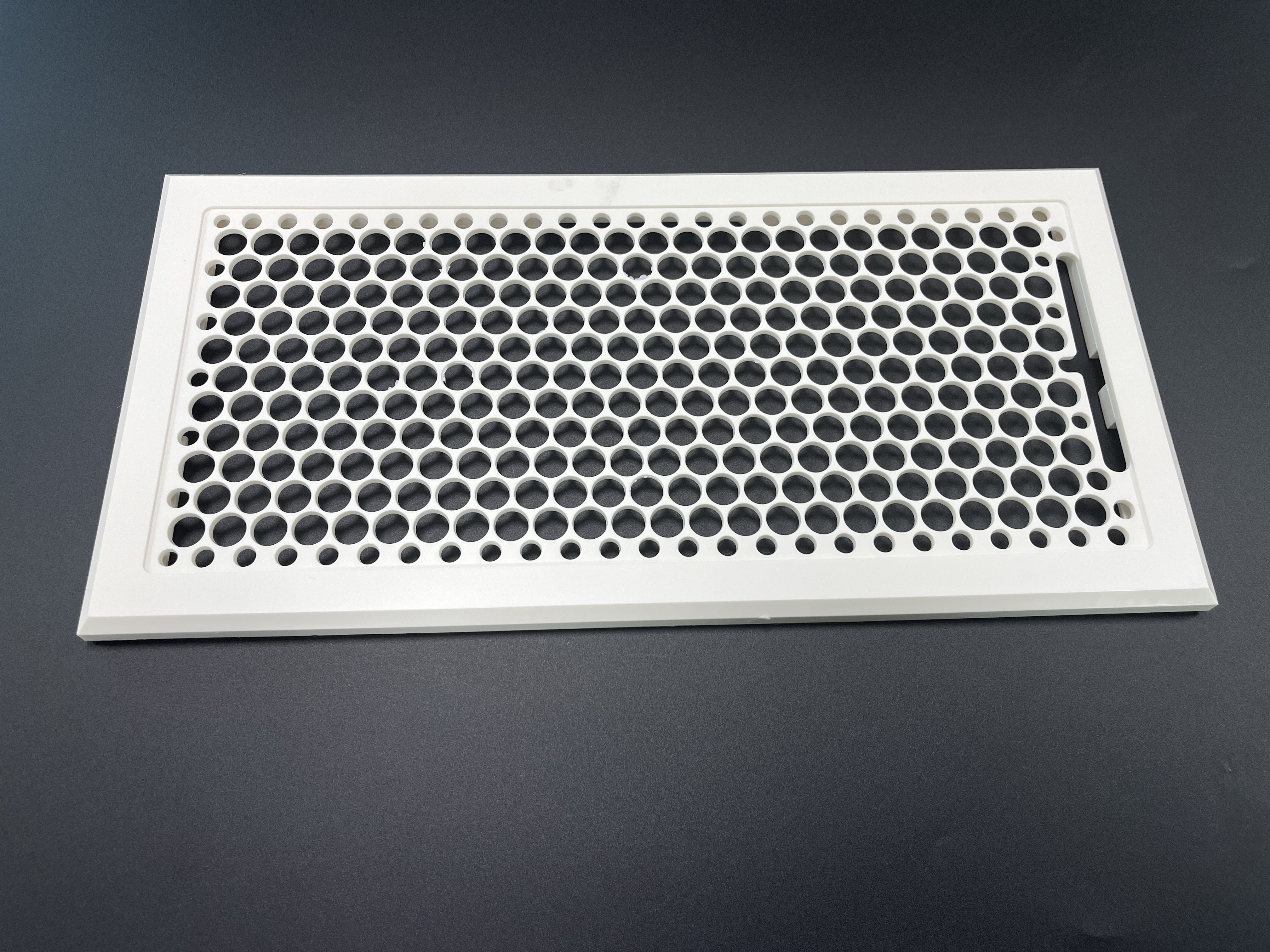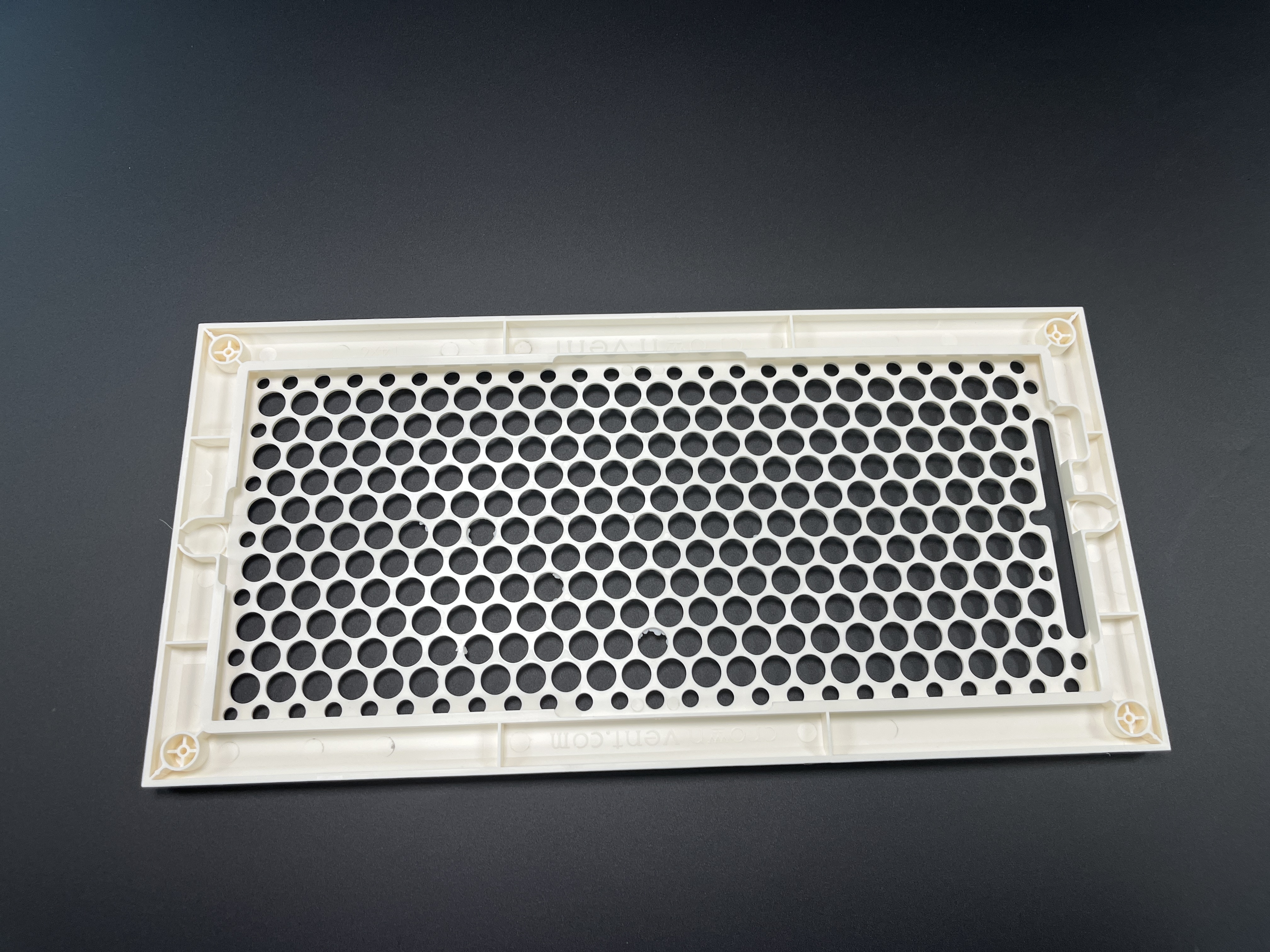 Design: Rectangular frame with honeycomb circular perforations; pre-molded mounting holes