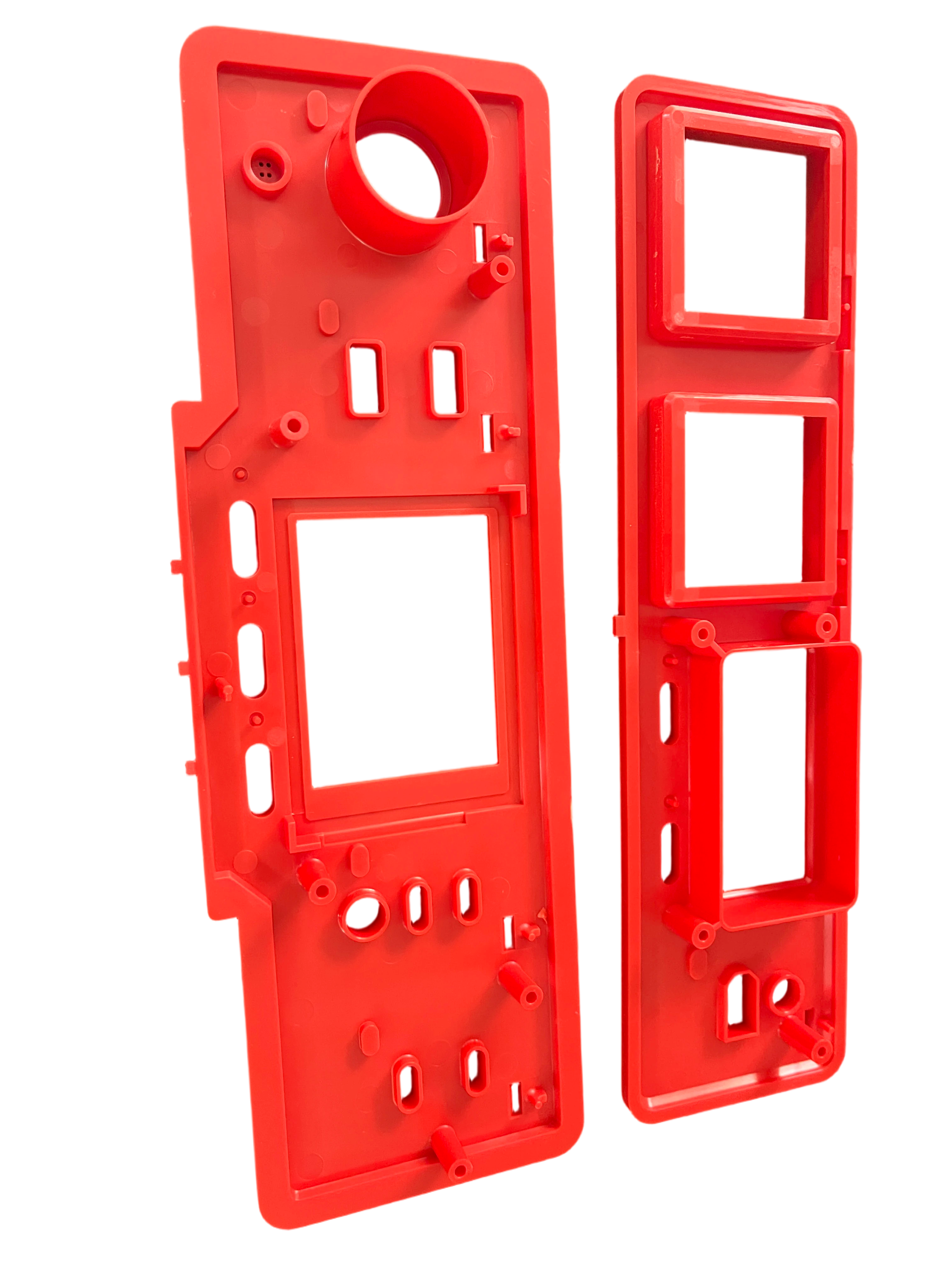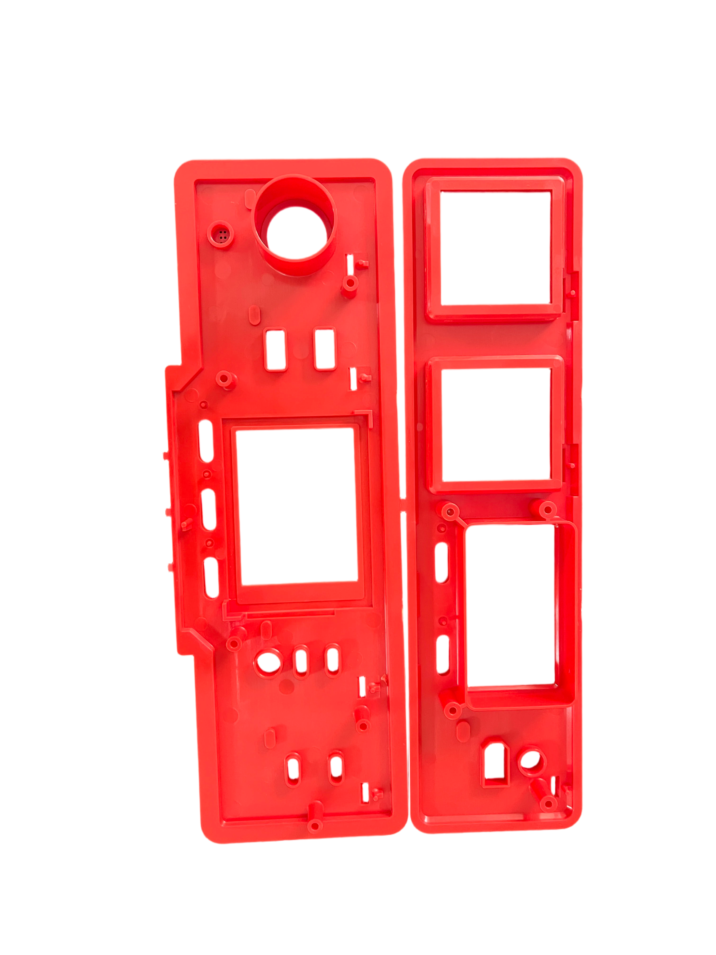 Bottom Panel (Main Housing): Includes a large central display cutout, a prominent circular stepped port for sensors, speakers, or knobs, and an array of auxiliary holes for indicator lights, microphones, and cable management. Strategically placed screw bosses and alignment pins enable robust, error-free assembly with the top panel and internal PCBs.